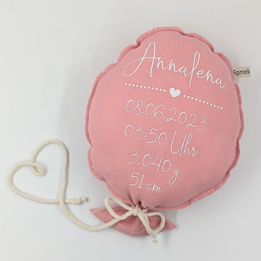 Stoffballon, GEBURTSDATEN HERZ, Wunschfarbe + Text personalisierbar