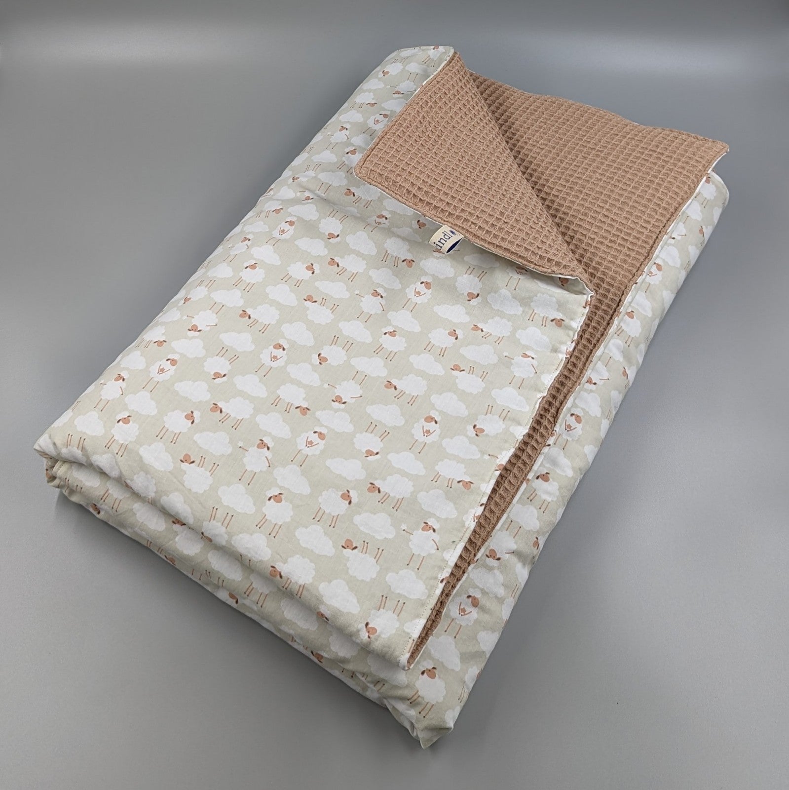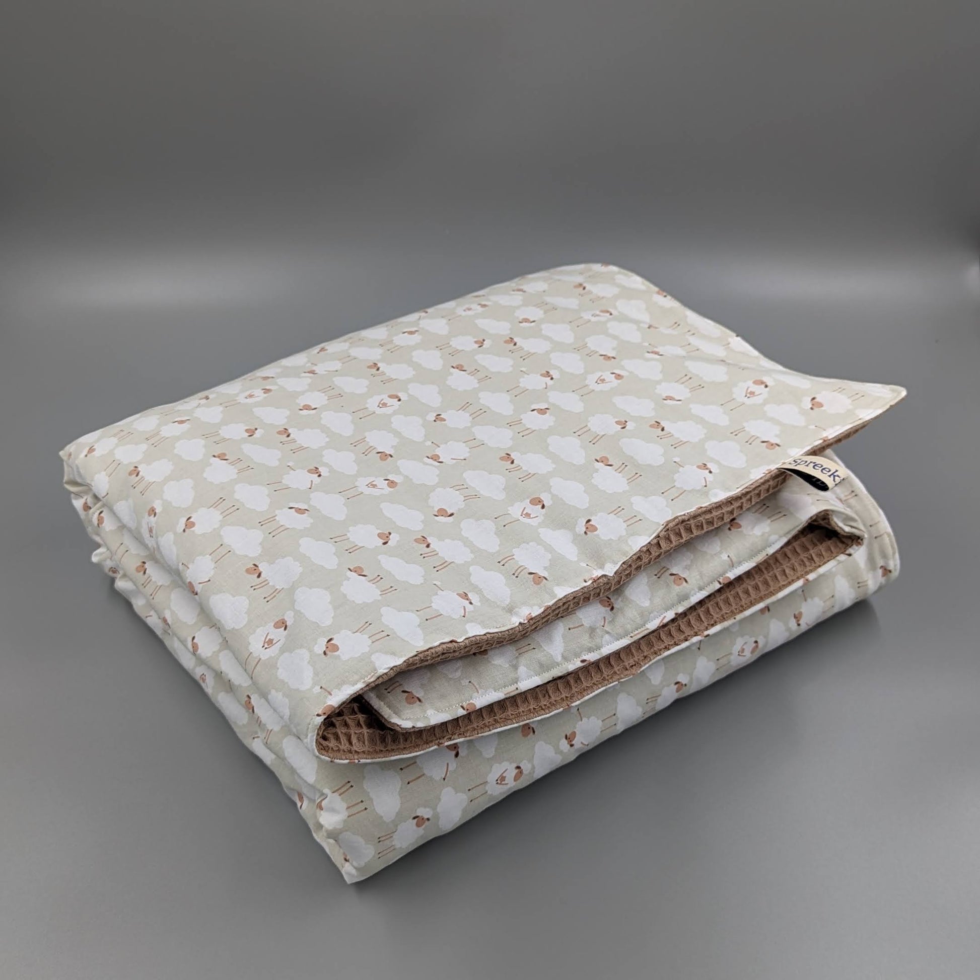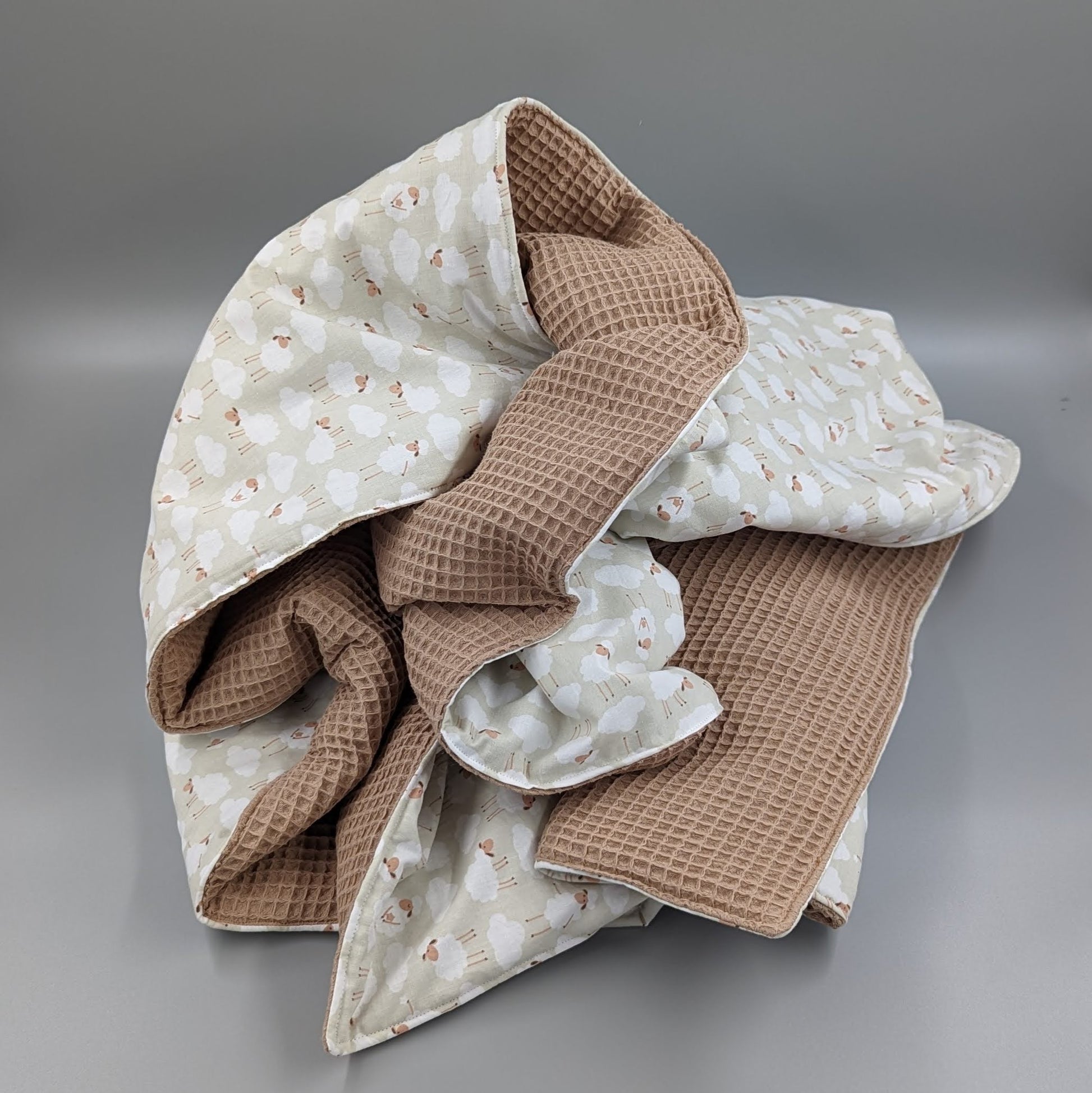 Hergestellt aus Baumwollstoff mit frechen Schäfchen. Die Rückseite ist aus hellbraunem Waffelpiqué, der etwas robuster ist und somit ideal auch mal auf dem Boden liegen kann.